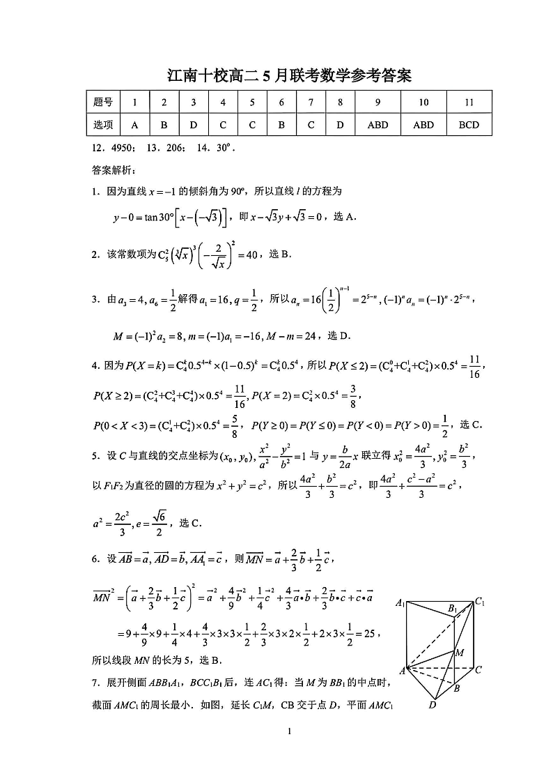 安徽省“江南十校”2024-2025学年高二下学期5月份阶段联考数学答案
