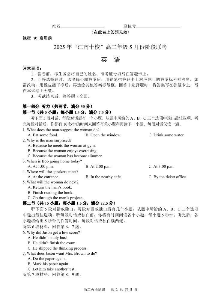 安徽省“江南十校”2024-2025学年高二下学期5月份阶段联考英语