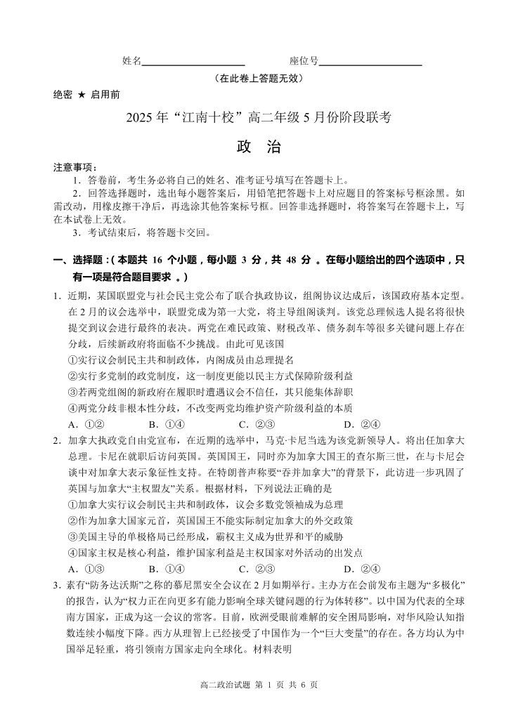 安徽省“江南十校”2024-2025学年高二下学期5月份阶段联考政治