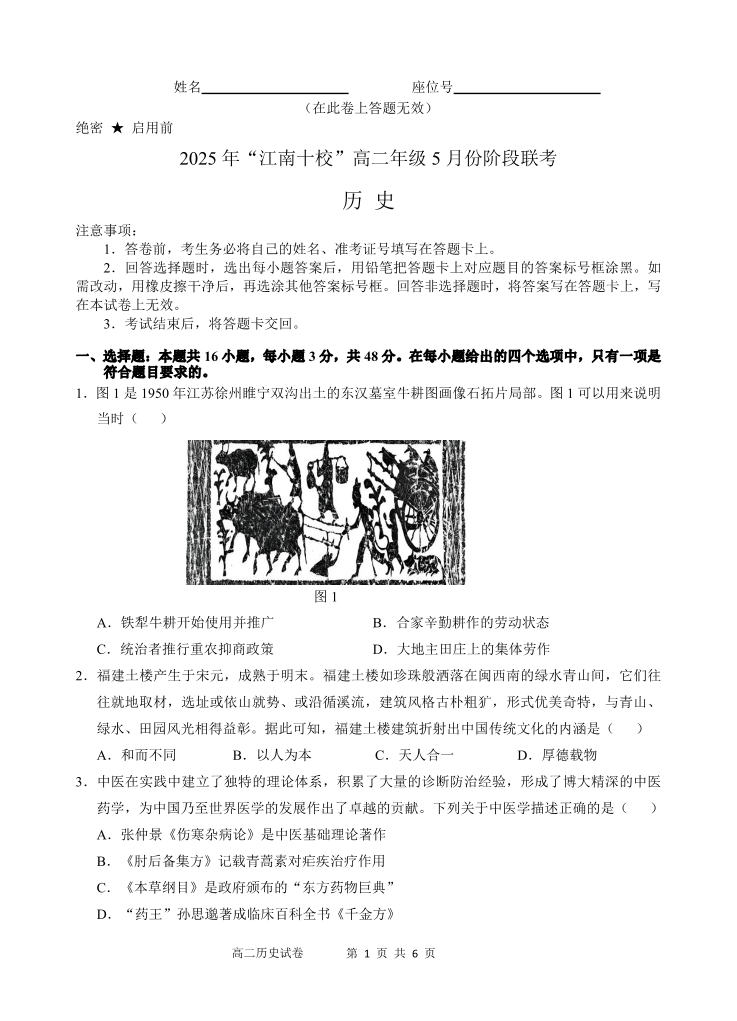 安徽省“江南十校”2024-2025学年高二下学期5月份阶段联考历史