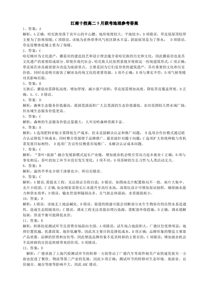 安徽省“江南十校”2024-2025学年高二下学期5月份阶段联考地理答案
