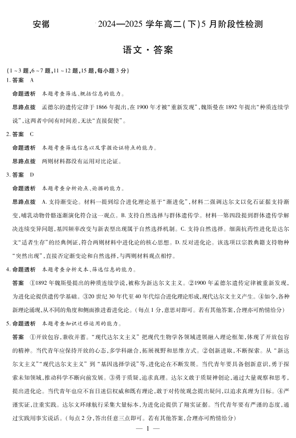 安徽省部分学校2024-2025学年高二下学期5月阶段性测试语文答案