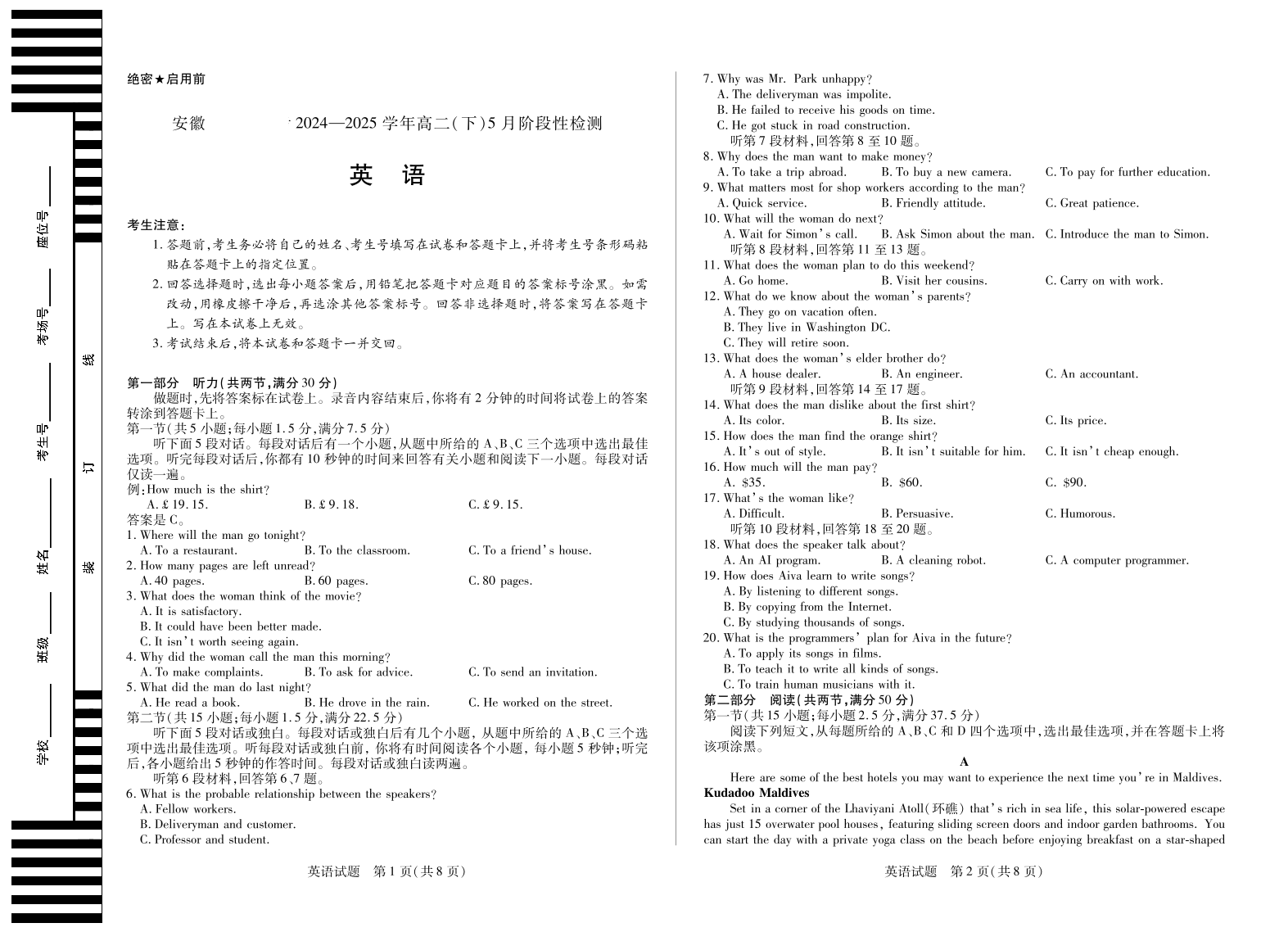 安徽省部分学校2024-2025学年高二下学期5月阶段性测试英语