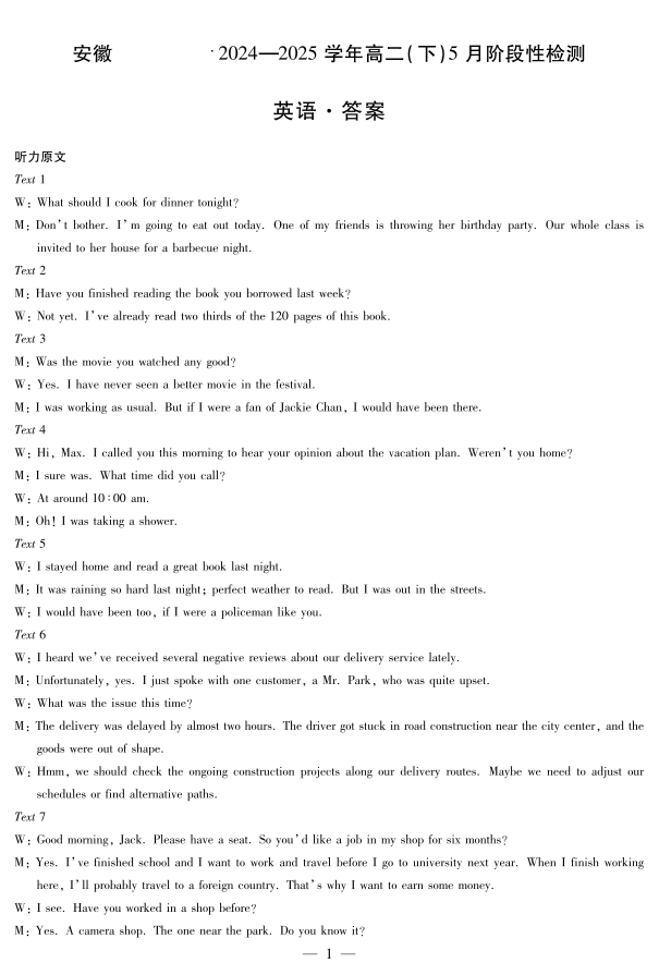 安徽省部分学校2024-2025学年高二下学期5月阶段性测试英语答案