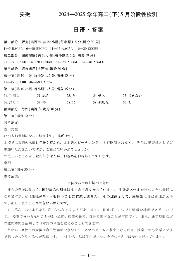 安徽省部分学校2024-2025学年高二下学期5月阶段性测试日语答案