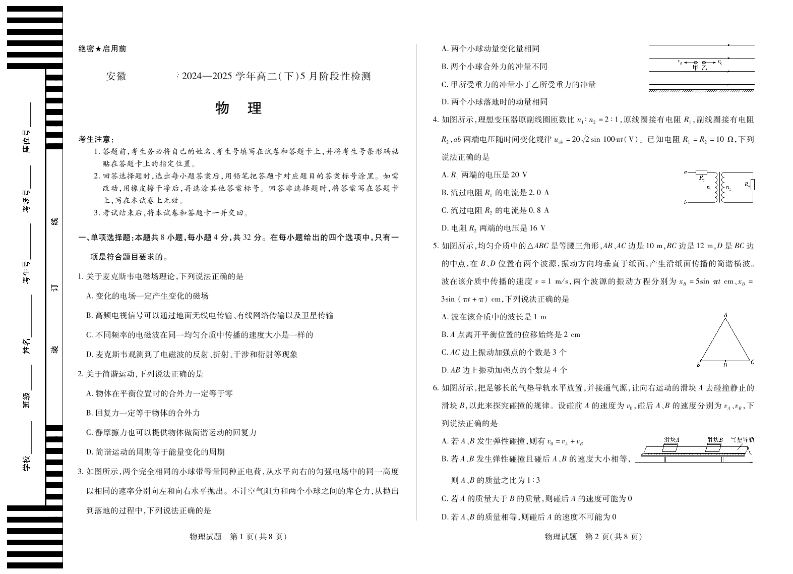 安徽省部分学校2024-2025学年高二下学期5月阶段性测试物理