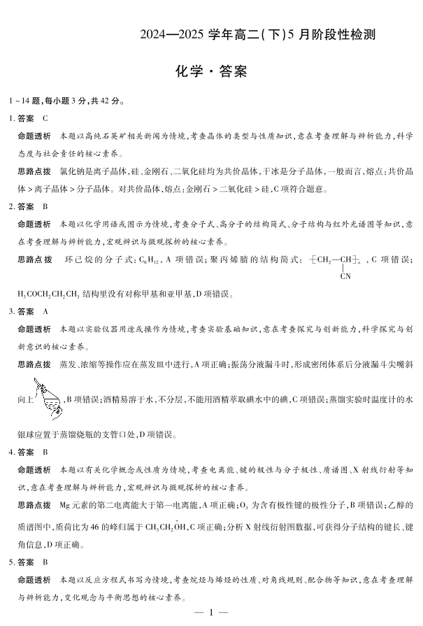安徽省部分学校2024-2025学年高二下学期5月阶段性测试化学答案