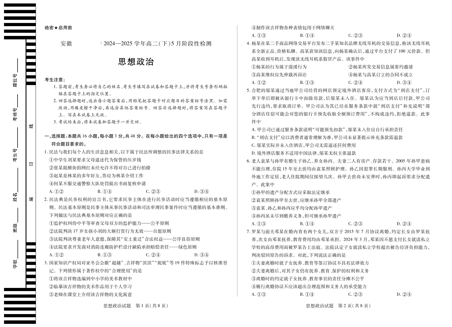 安徽省部分学校2024-2025学年高二下学期5月阶段性测试政治