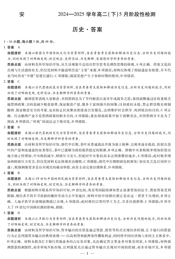 安徽省部分学校2024-2025学年高二下学期5月阶段性测试历史答案