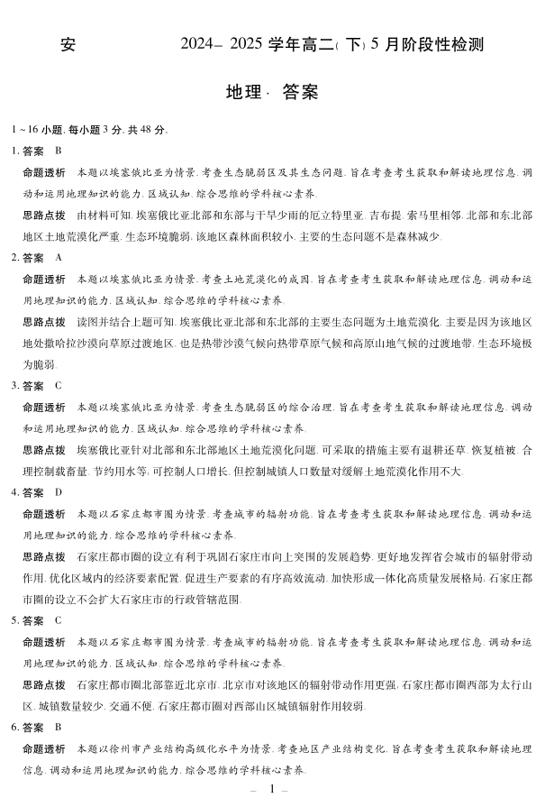 安徽省部分学校2024-2025学年高二下学期5月阶段性测试地理答案