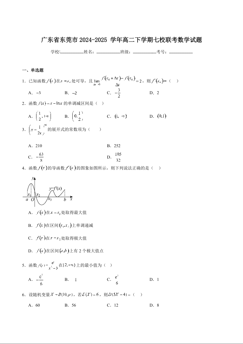 广东省东莞市七校2024-2025学年高二下学期5月期中联考数学+答案