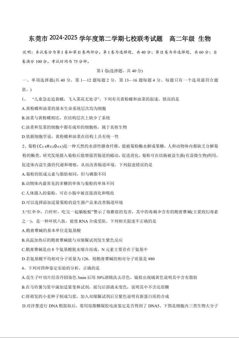 广东省东莞市七校2024-2025学年高二下学期5月期中联考生物