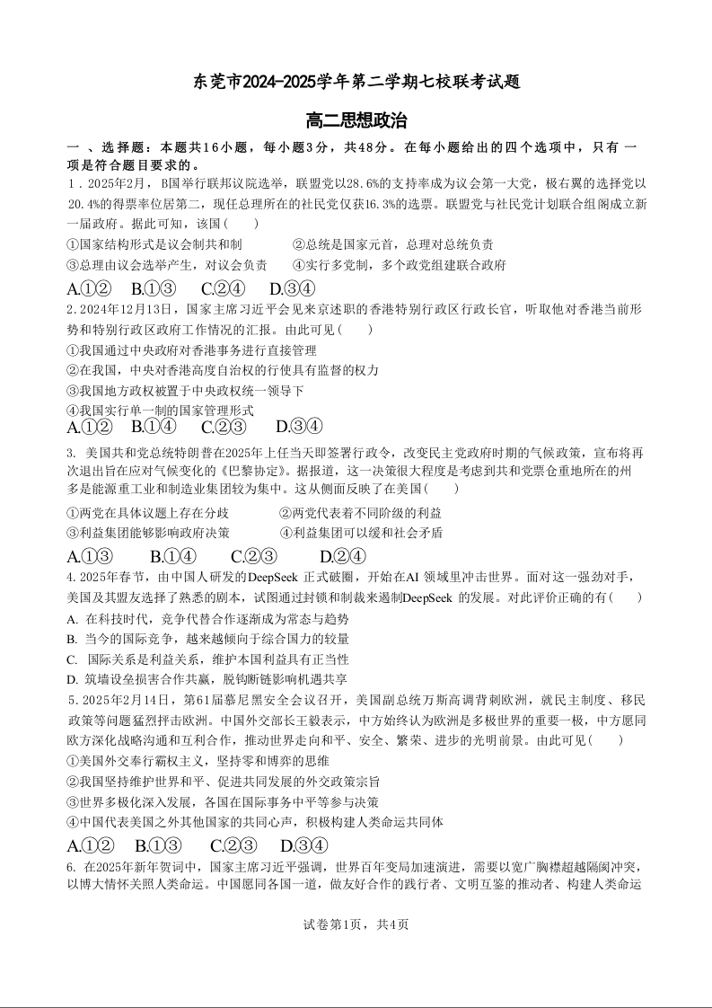 广东省东莞市七校2024-2025学年高二下学期5月期中联考政治+答案