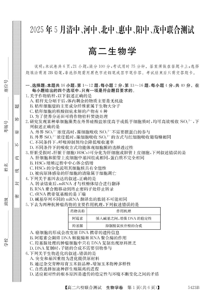 广东省六校(清中、河中、惠中、茂中等)2024-2025学年高二下学期5月联合测试生物+答案