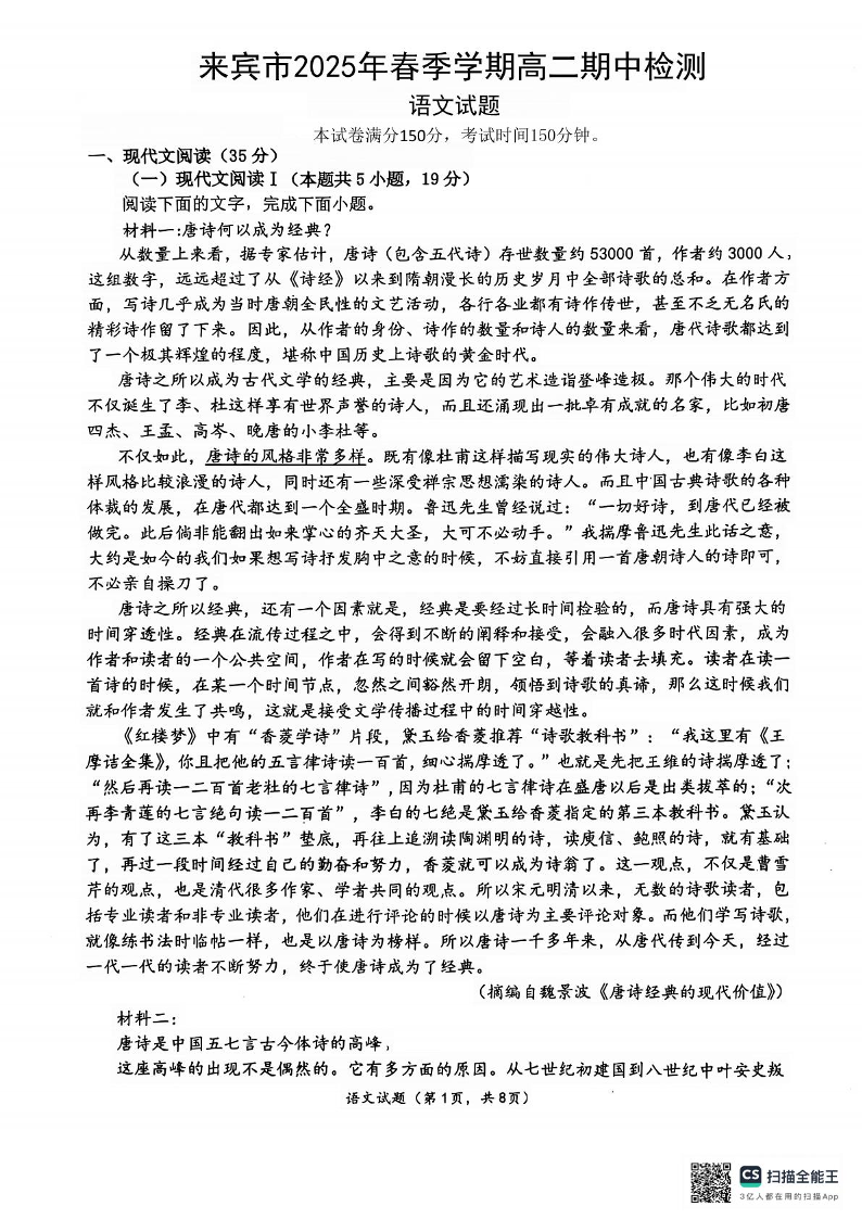 广西来宾市2024-2025学年高二下学期5月期中考试语文