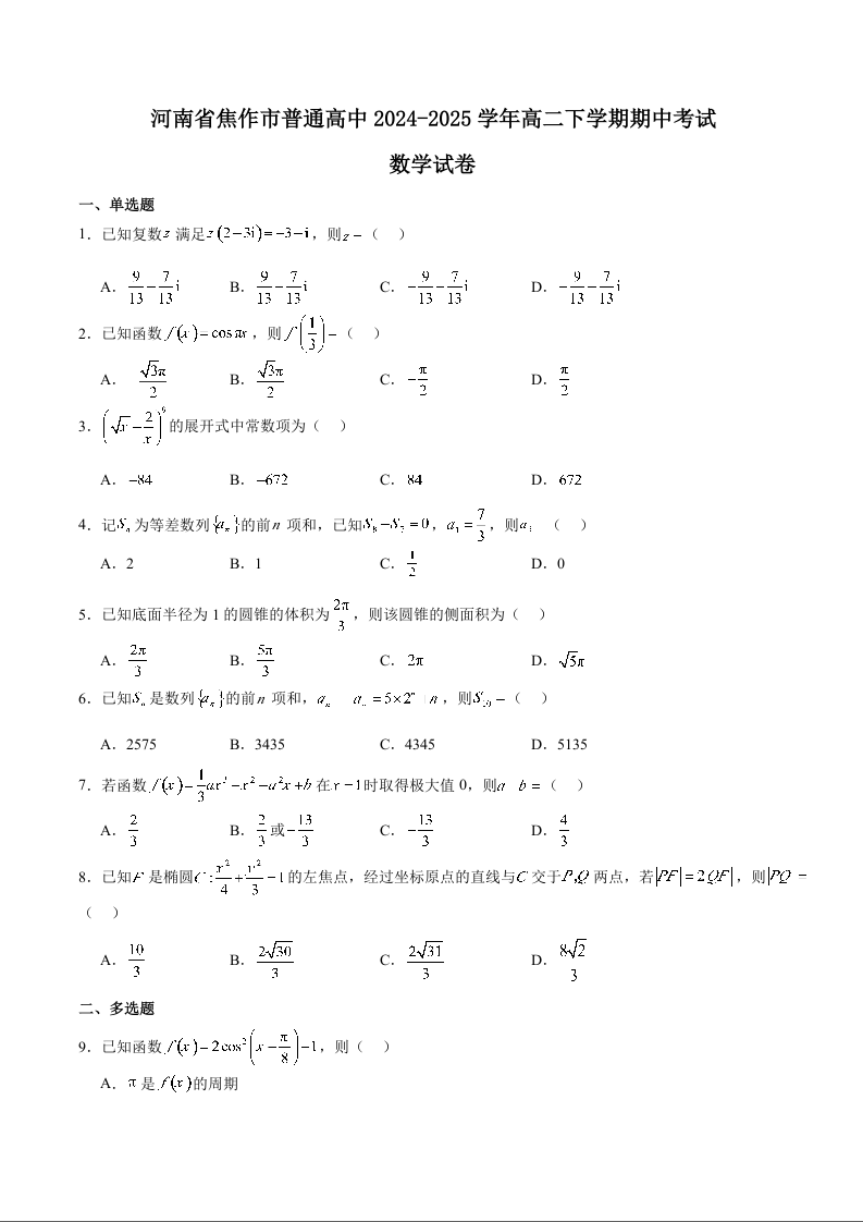 河南省焦作市普通高中2024-2025学年高二下学期期中考试数学+答案
