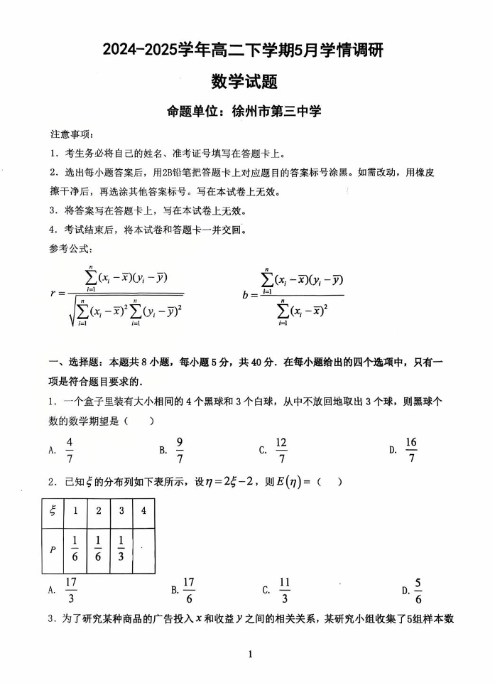 江苏省南京市、镇江市、徐州市联盟校2024-2025学年高二下学期5月学情调研试题数学