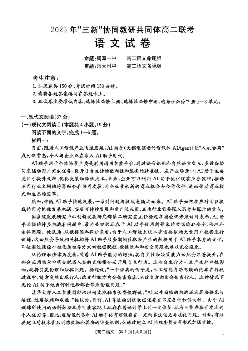江西省三新协同教研共同体2024-2025学年高二下学期5月联考语文+答案