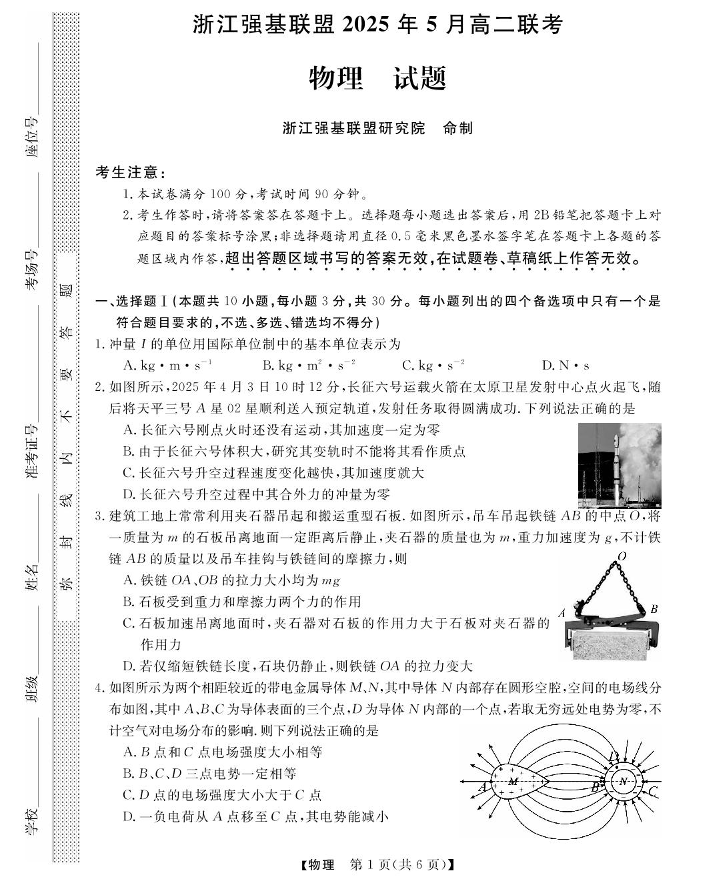 浙江省强基联盟2024-2025学年高二下学期5月联考试题物理+答案