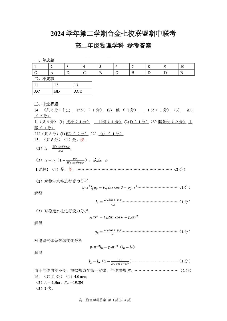浙江省台金七校联盟2024-2025学年高二下学期5月期中联考试题物理答案