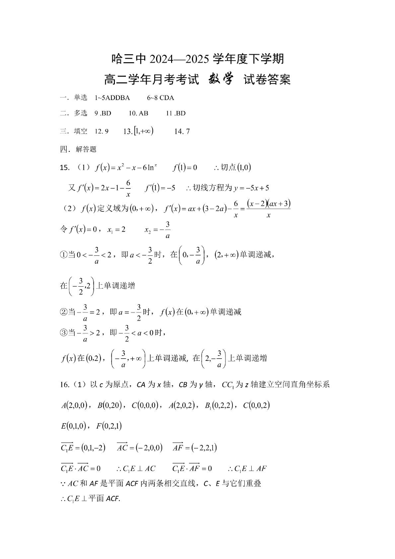 黑龙江省哈尔滨市第三中学校2024-2025学年高二下学期6月月考数学答案