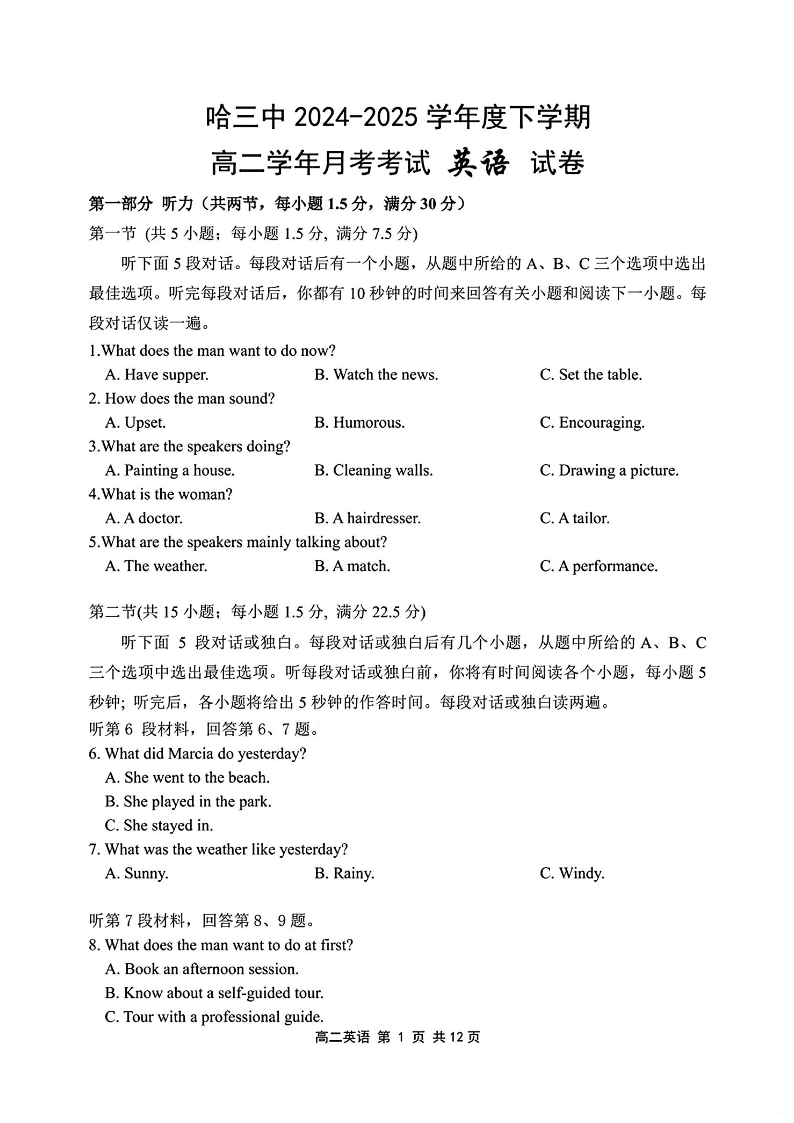 黑龙江省哈尔滨市第三中学校2024-2025学年高二下学期6月月考英语+答案
