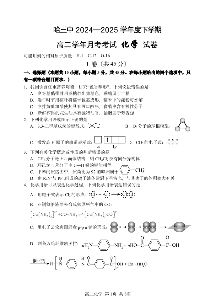 黑龙江省哈尔滨市第三中学校2024-2025学年高二下学期6月月考化学+答案