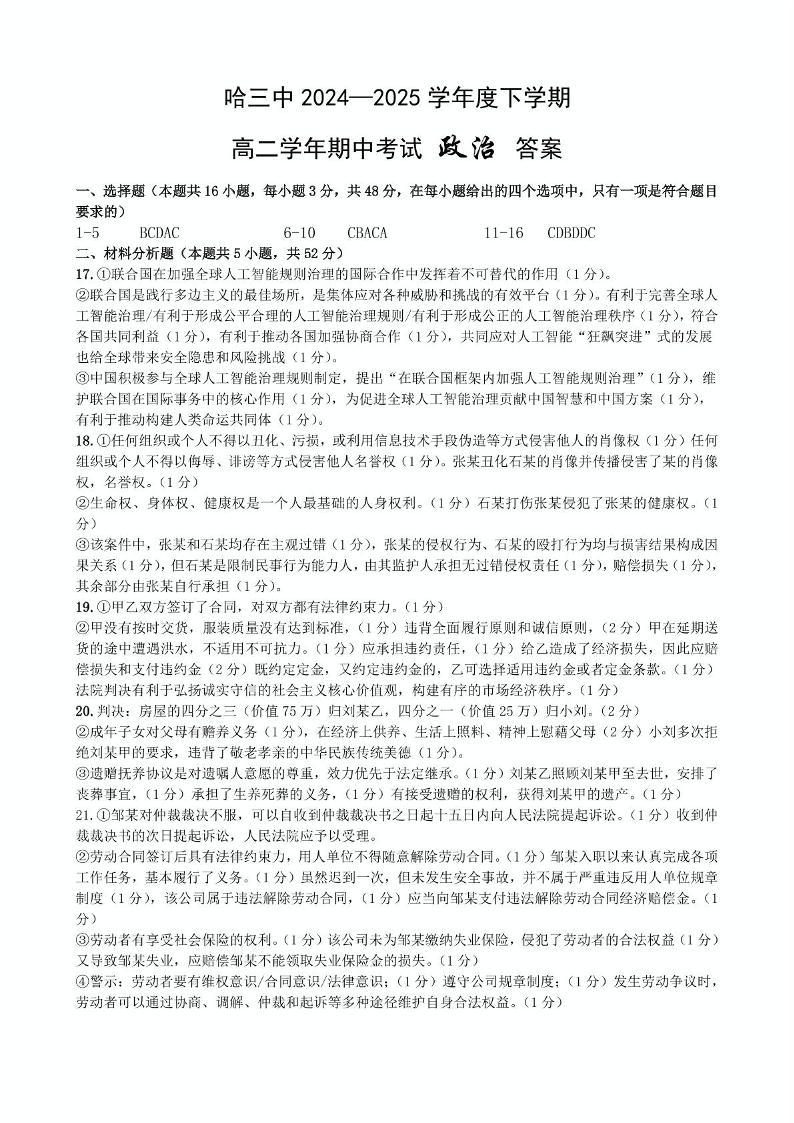 黑龙江省哈尔滨市第三中学校2024-2025学年高二下学期6月月考政治答案