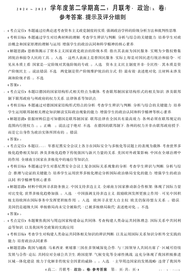 安徽省县中联盟2024-2025学年高二下学期5月联考政治答案