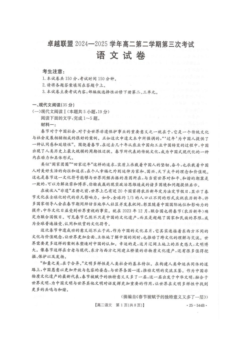 河北省邢台市卓越联盟2024-2025学年高二下学期第三次考试语文
