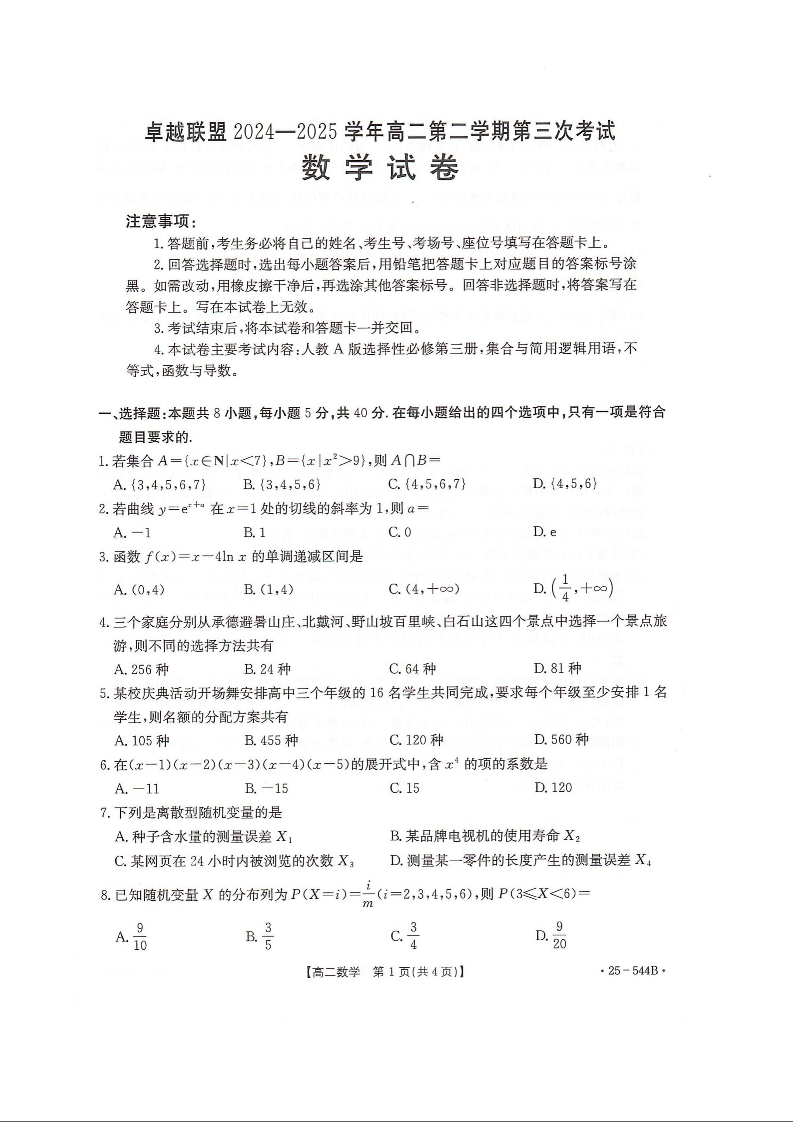 河北省邢台市卓越联盟2024-2025学年高二下学期第三次考试数学