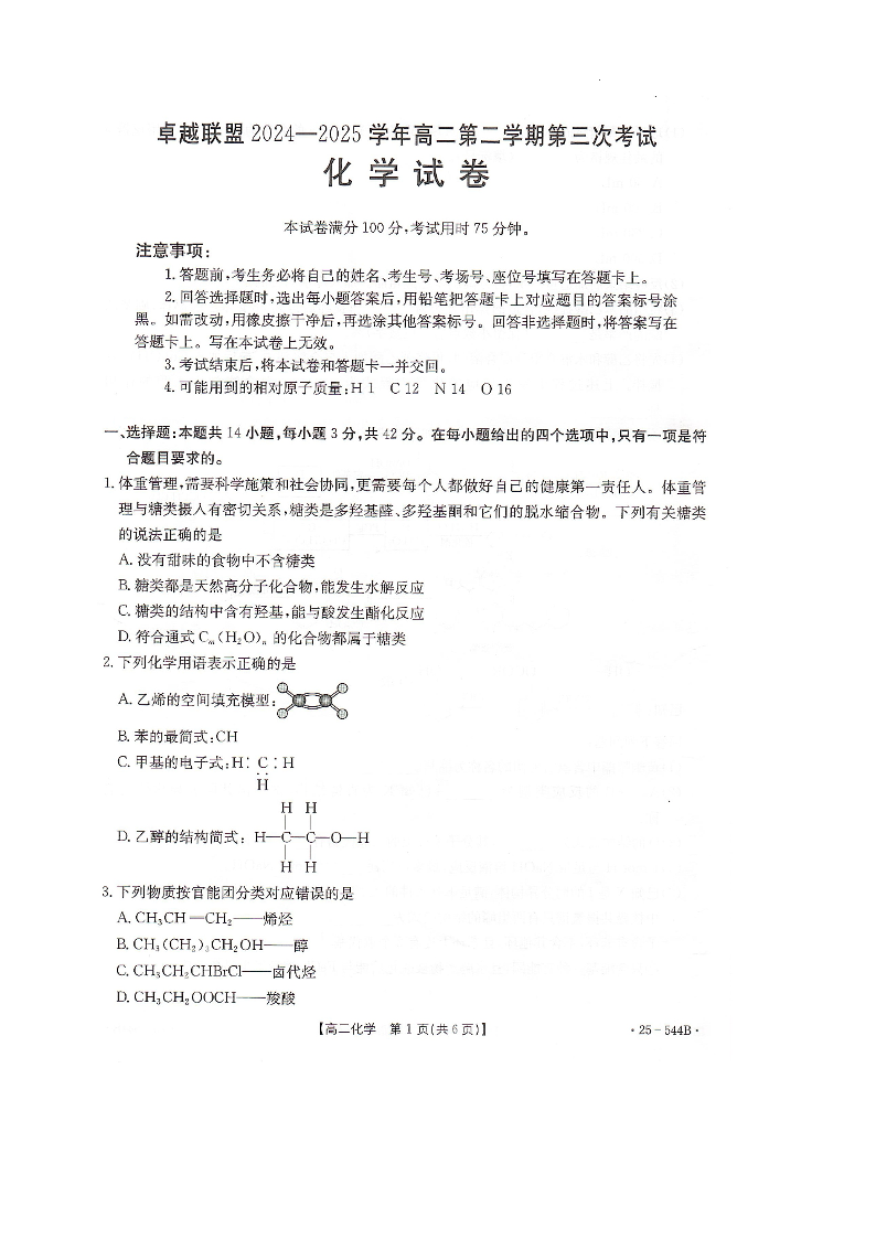 河北省邢台市卓越联盟2024-2025学年高二下学期第三次考试化学+答案