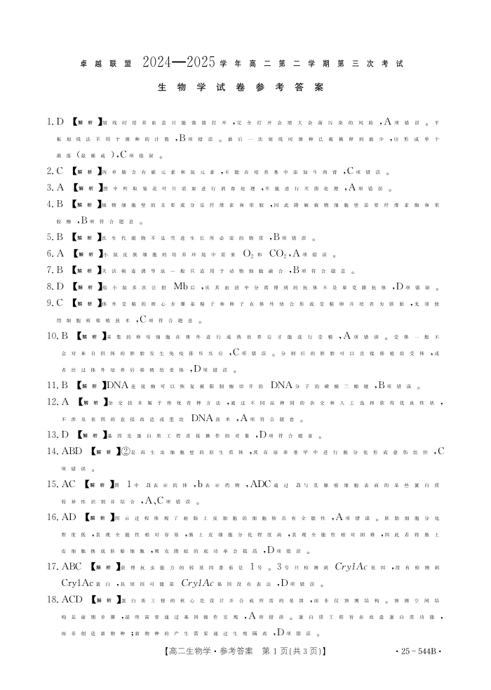 河北省邢台市卓越联盟2024-2025学年高二下学期第三次考试生物答案
