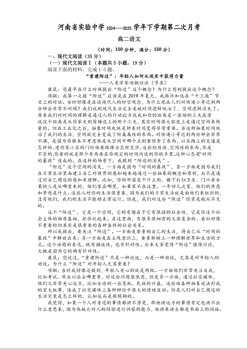 河南省实验中学2024-2025学年高二下学期第二次月考语文