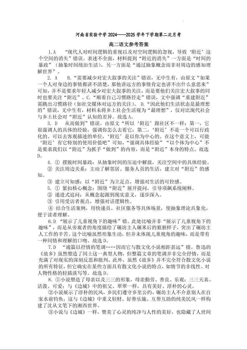 河南省实验中学2024-2025学年高二下学期第二次月考语文答案