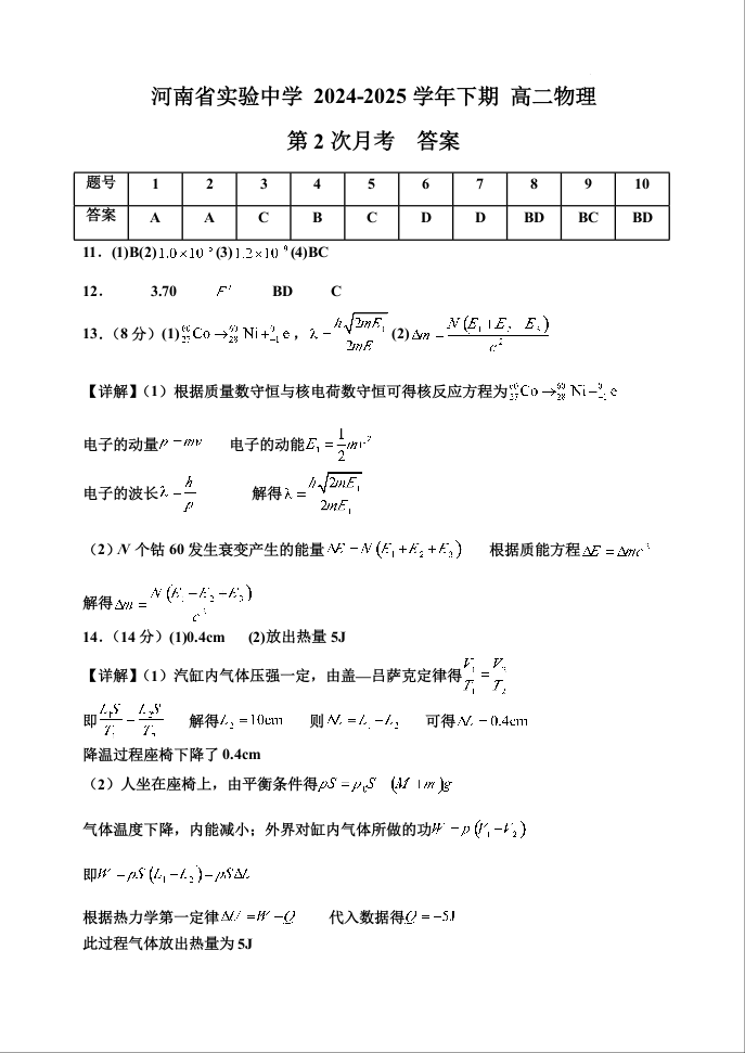 河南省实验中学2024-2025学年高二下学期第二次月考物理答案