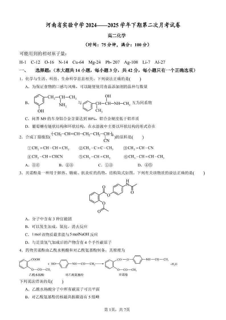 河南省实验中学2024-2025学年高二下学期第二次月考化学