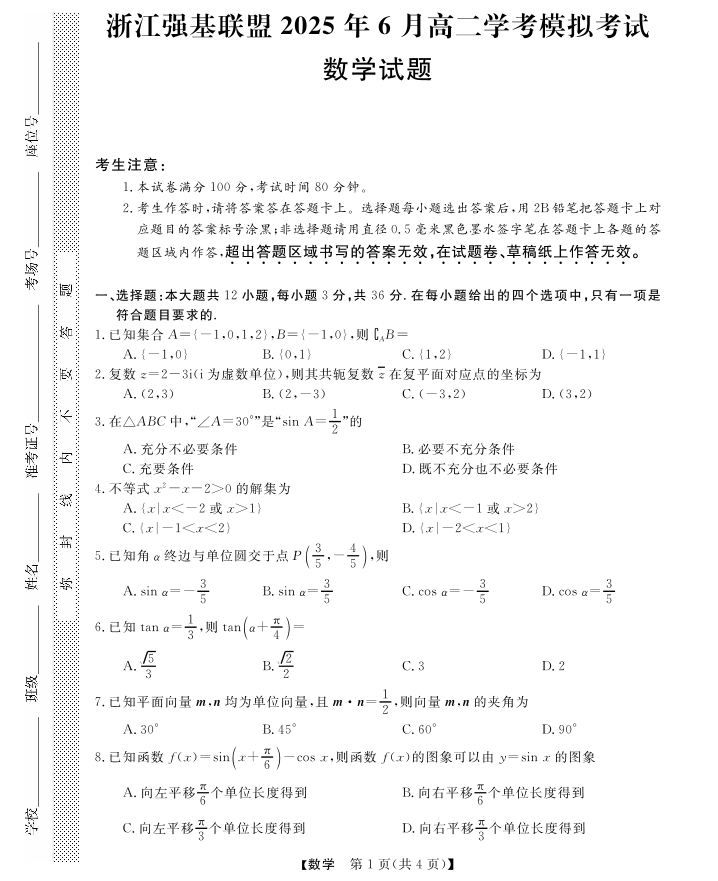 浙江省强基联盟2025年6月学考模拟考试数学+答案