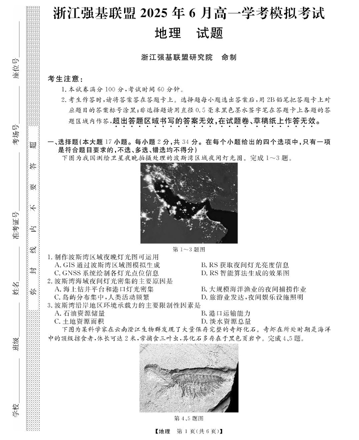 浙江省强基联盟2025年6月学考模拟考试地理