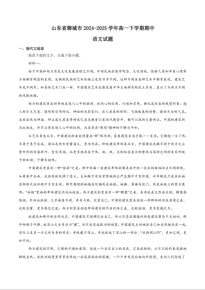 山东省聊城市2024-2025学年高一下学期期中考试语文+答案