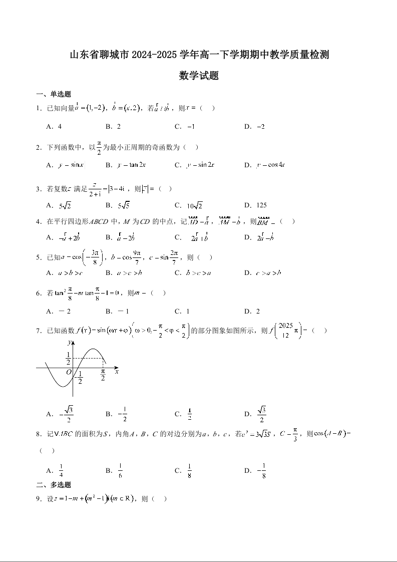 山东省聊城市2024-2025学年高一下学期期中考试数学+答案