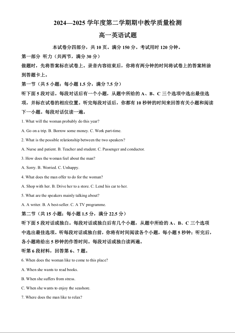 山东省聊城市2024-2025学年高一下学期期中考试英语+答案