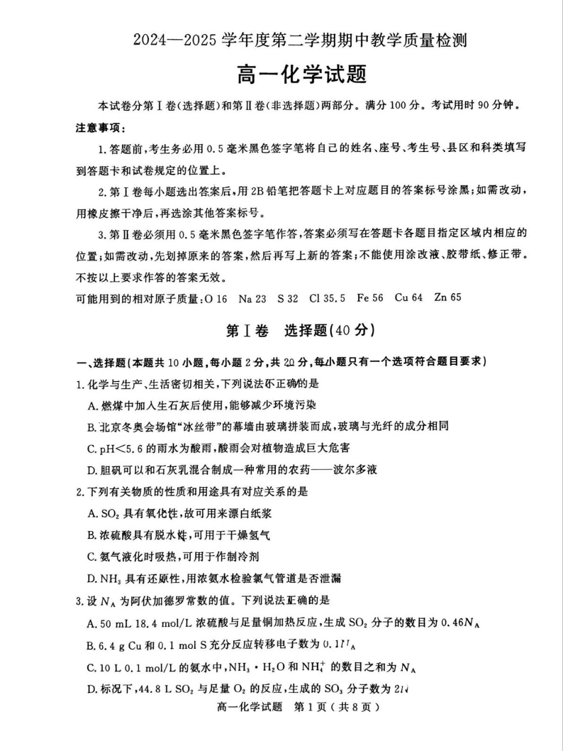 山东省聊城市2024-2025学年高一下学期期中考试化学+答案