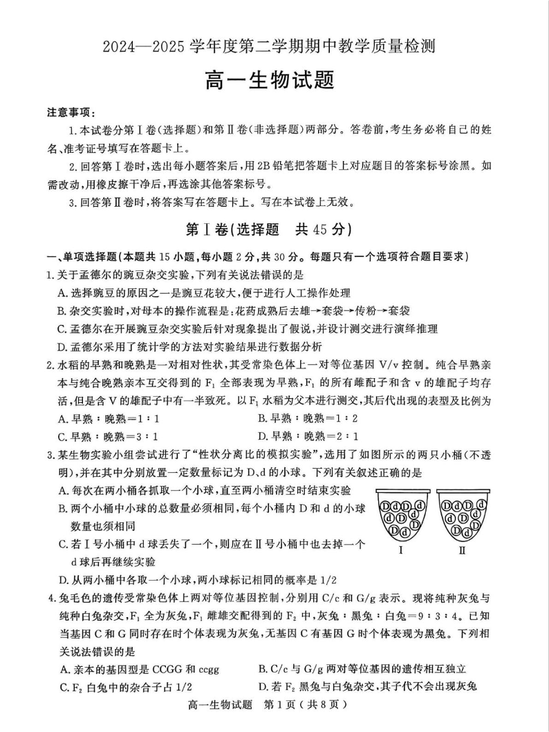 山东省聊城市2024-2025学年高一下学期期中考试生物+答案