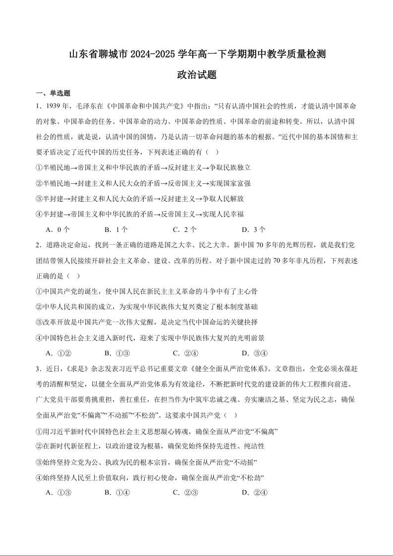 山东省聊城市2024-2025学年高一下学期期中考试政治+答案