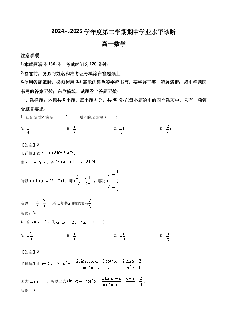 山东省烟台市2024-2025学年高一下学期期中学业水平诊断试题数学+答案