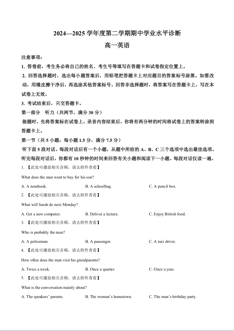 山东省烟台市2024-2025学年高一下学期期中学业水平诊断试题英语+答案