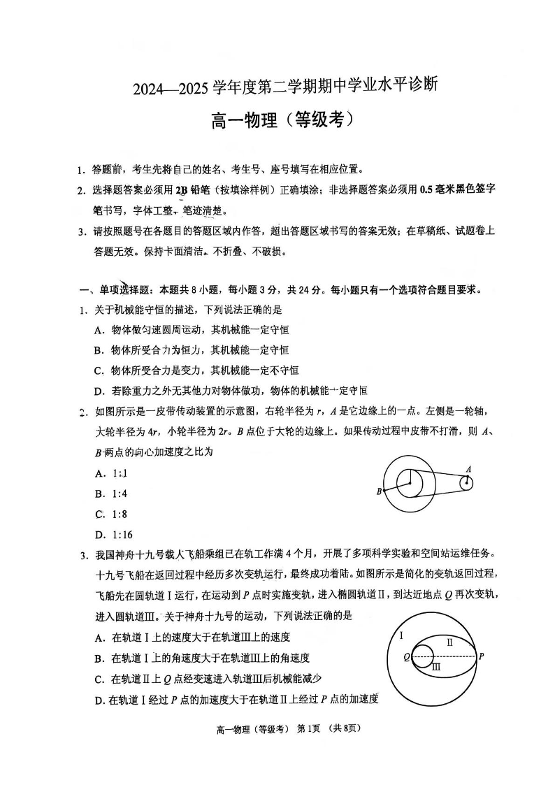 山东省烟台市2024-2025学年高一下学期期中学业水平诊断试题物理+答案
