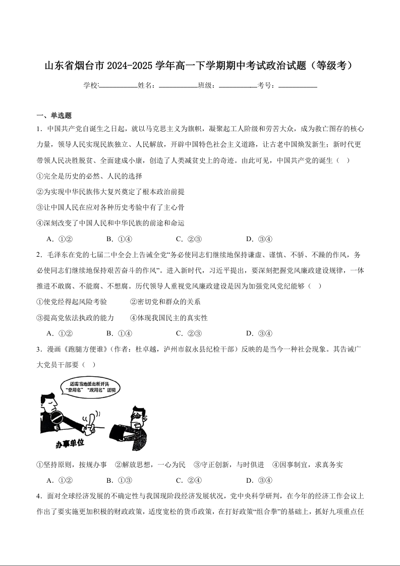 山东省烟台市2024-2025学年高一下学期期中学业水平诊断试题政治(等级考)+答案