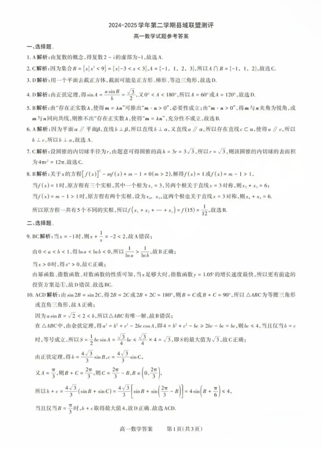山西省县域联盟2024-2025学年高一下学期5月月考数学答案